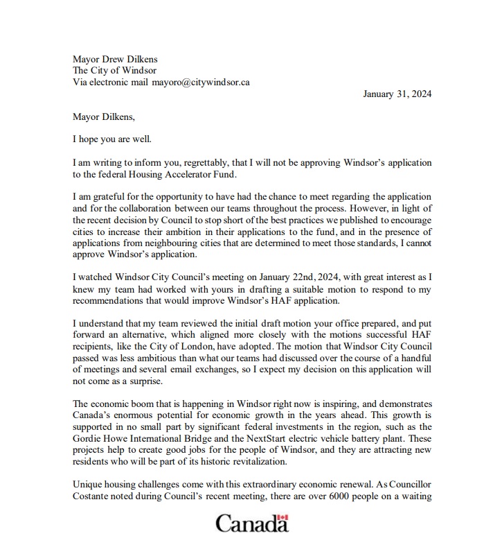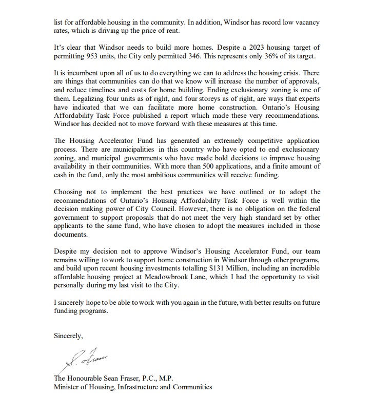A copy of the letter Housing Minister Sean Fraser sent to announce Windsor's application to the Housing Accelerator Fund had been rejected. Jan. 31, 2024 (Photo: AM800)