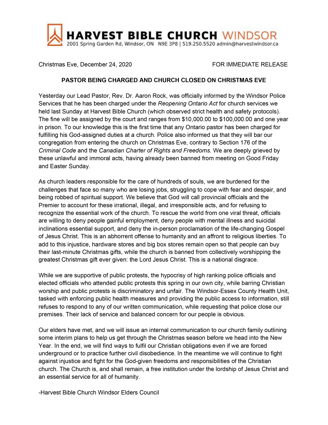 The full release from Harvest Church: