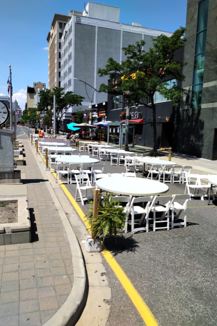 Extended patios have been set up in front of establishments on Ouellette Avenue, July 1, 2020 (Photo courtesy: Patrick Kim, co-owner of The Chelsea Ultra Pub)