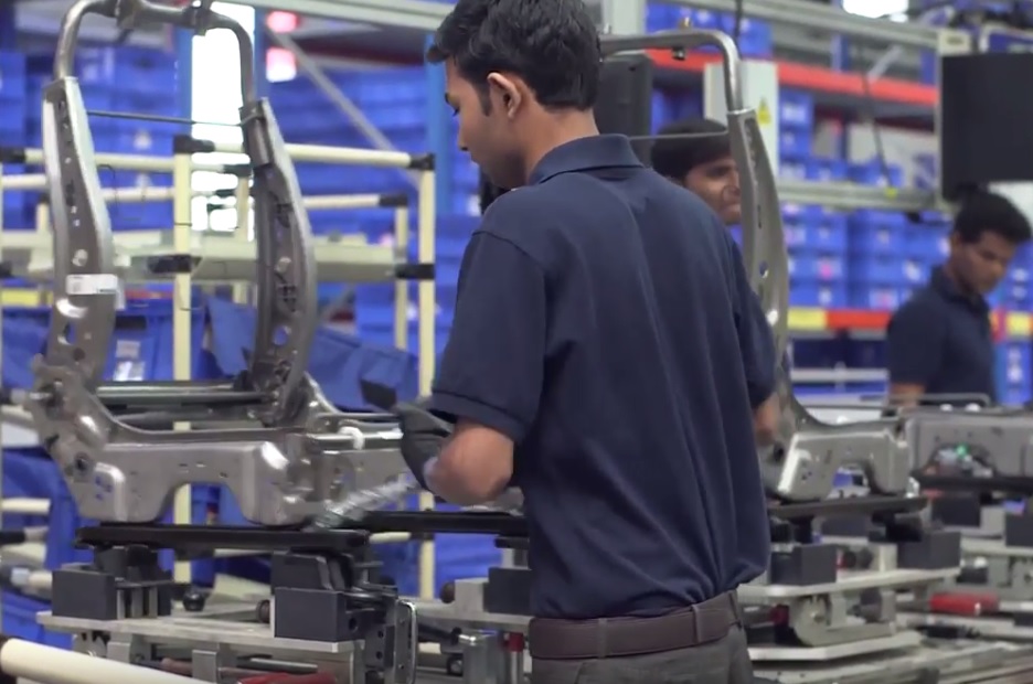 Worker at Magna works on an auto seat frame (via Magna YouTube video)