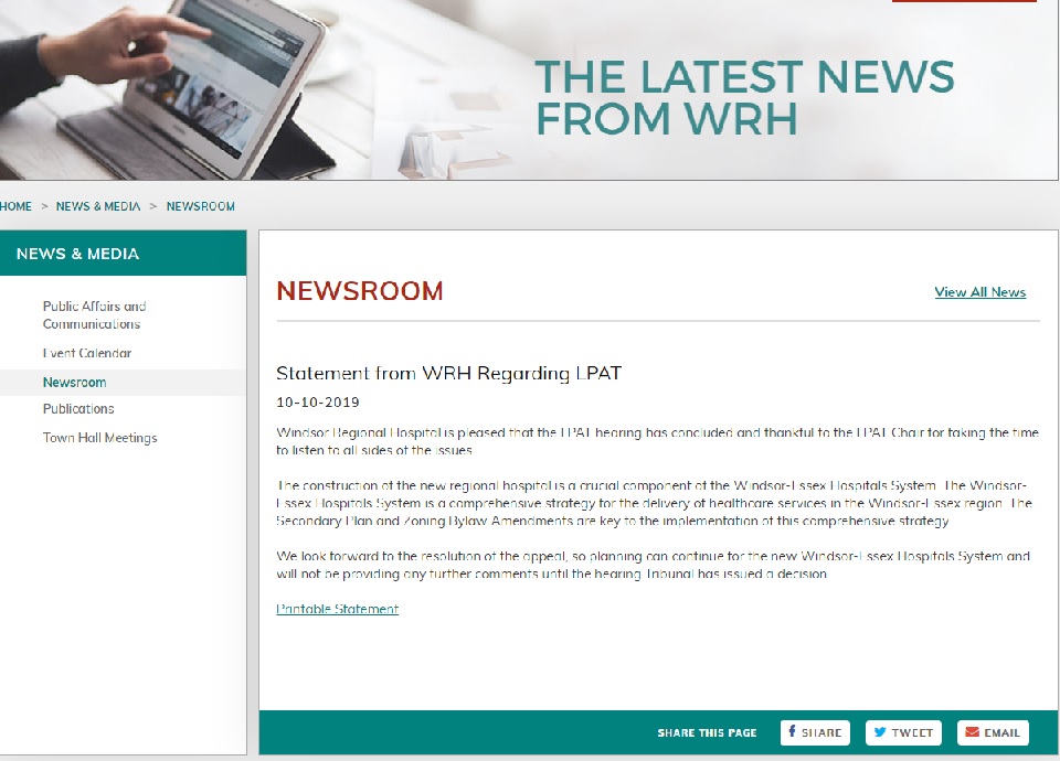 Windsor Regioanl Hospital statement on L-PAT hearing conclusion, October 10, 2019 (via WRH website)