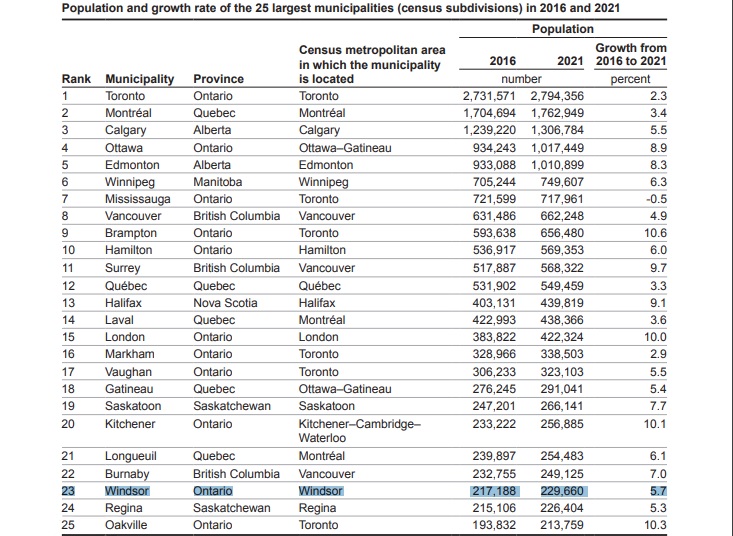 The City of Windsor is now Canada's 23rd largest city with a population of 229,660 in 2021, a 5.7 per cent increase over the 217,188 recorded in 2016.