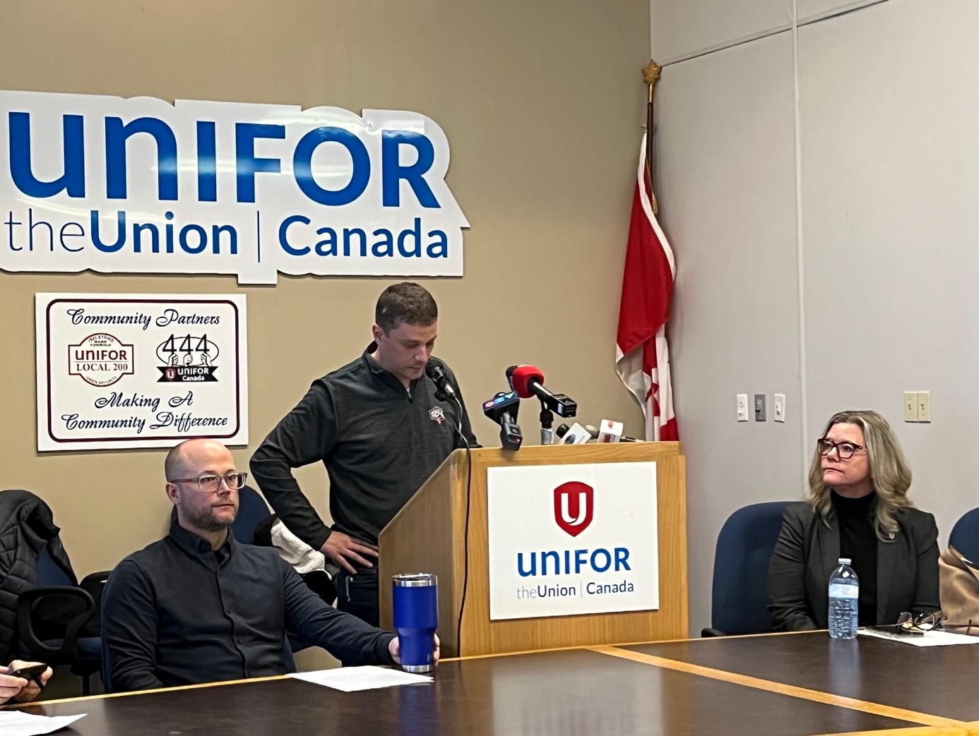 CWA Canada Local 30553 Chapel Chairperson Shawn Bussey, Unifor Local 517-G President Colin Brian and Julie Kotsis, Unifor Media Council Chairperson and First Vice-President of Unifor Local 240, speak to the media following an announcement by Postmedia that it would no longer print the newspaper in Windsor. Jan. 31, 2023 (Photo by Rusty Thomson)