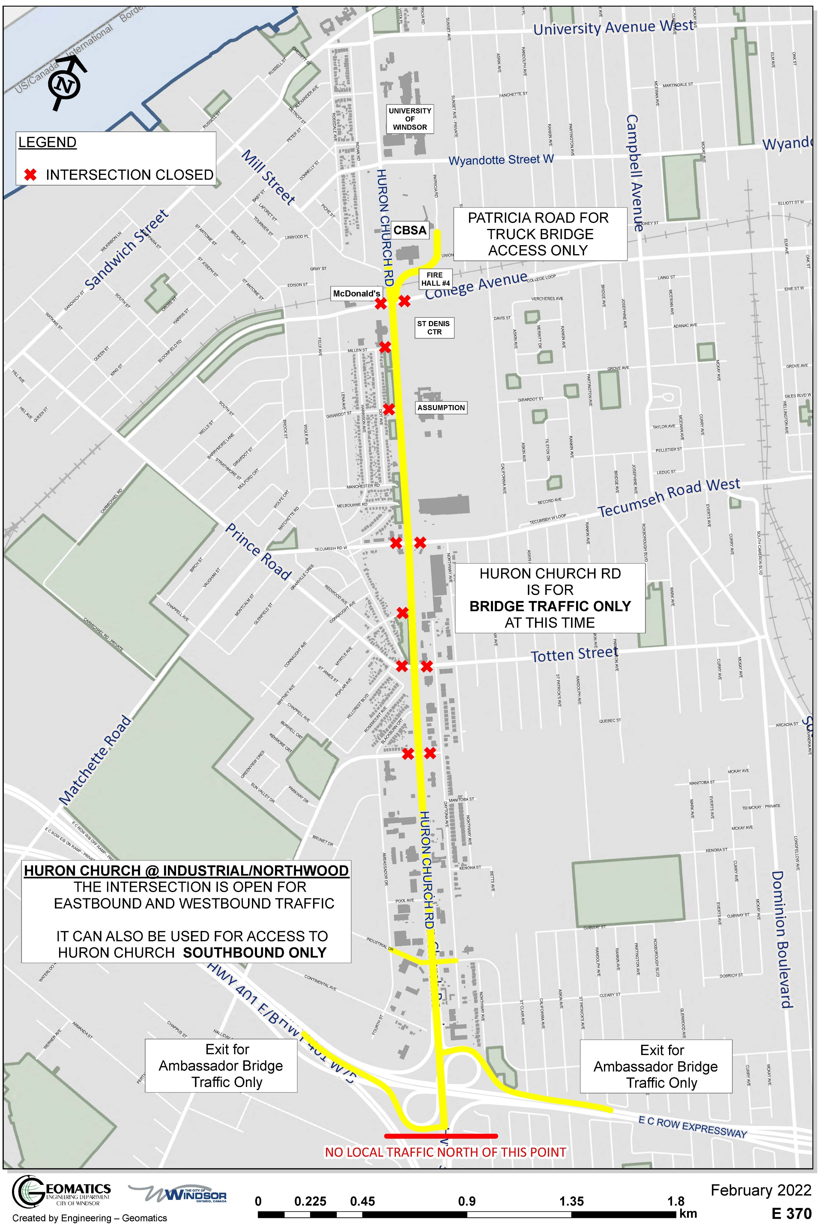 Industrial Drive and Northwood Street are open for eastbound, westbound and for access to travel southbound on Huron Church Road.