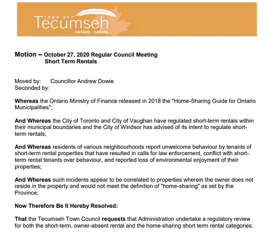 Earlier this month, Windsor city council voted in favour of creating a new bylaw for short term rentals.