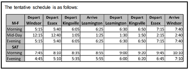 The City's Environment, Transportation & Public Safety Standing Committee has approved a recommendation to enter into a pilot project with the Municipality of Leamington to provide a route that also stops in Essex and Kingsville.