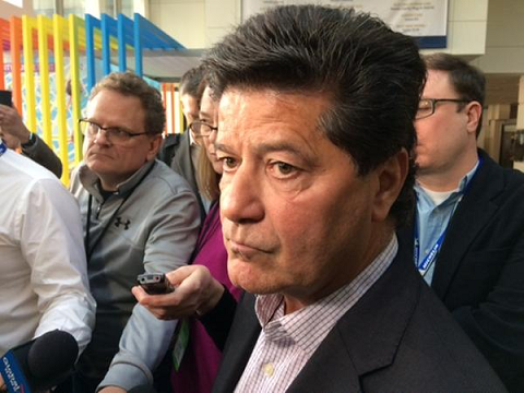 Unifor National Presidents speaks to reporters at North American International Auto Show in Detroit, January 14, 2019 (Photo by AM800's Rob Hindi)