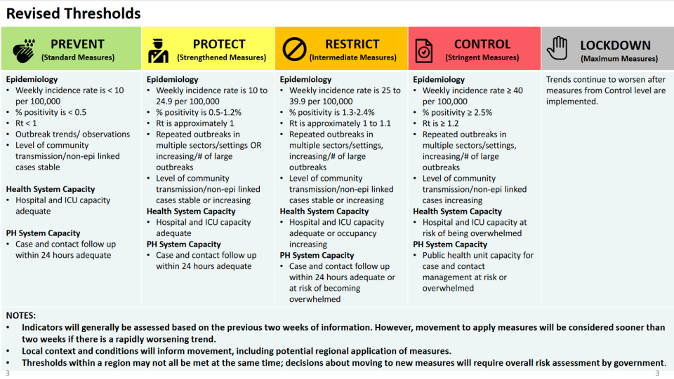Lambton Public Health will enter the Grey-Lockdown level, Northwestern Health Unit will move into Red-Control and Leeds, Grenville and Lanark District Health Unit will head into Yellow.
