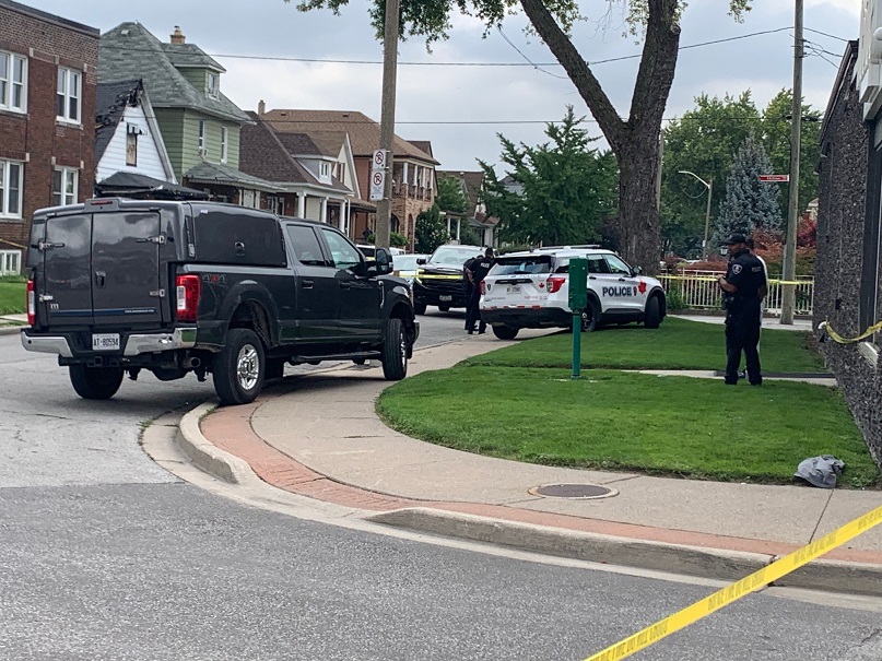 A heavy police presence is seen at the corner of Erie Street and Pierre Avenue. August 15, 2023. (Photo by AM800's Aaron Mahoney)
