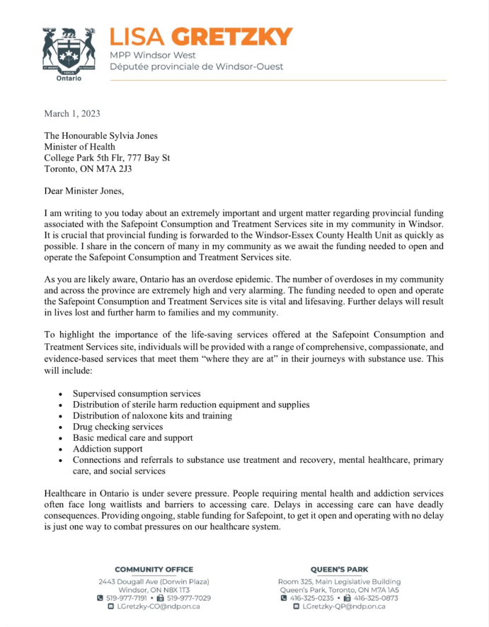 On Wednesday, Lisa Gretzky sent a letter to Health Minister Sylvia Jones about the need for the urgent funding to open and operate the CTS in Windsor without delay.