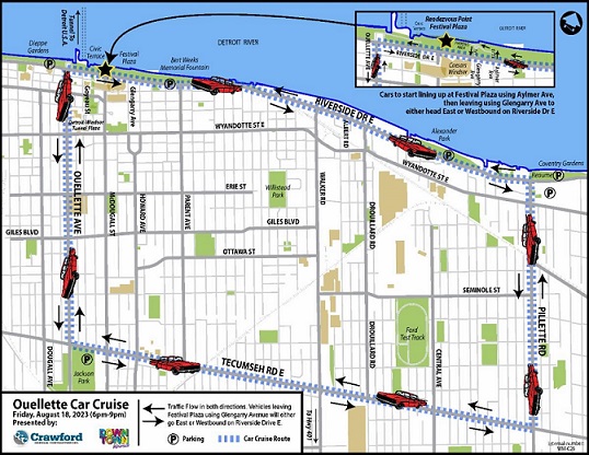 8th annual Ouellette Car Cruise map. July 19, 2023 (Photo Credit: Courtesy of the Downtown Windsor BIA)