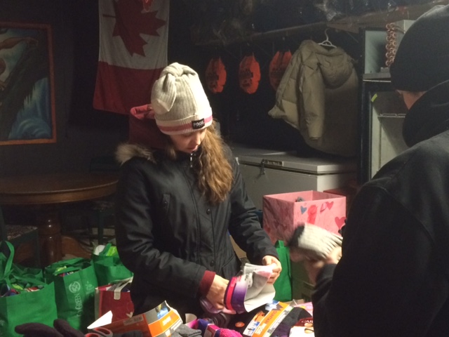 Sarah Lewis handing out one of the hundreds of pairs of socks to the homeless (photo by AM800's Peter Langille)