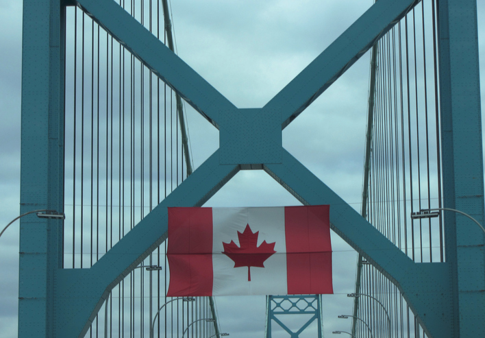 The Canadian Flag is seen on the Ambassador Bridge between Windsor and Detroit. (Photo courtesy iStock/Bee-Creative)