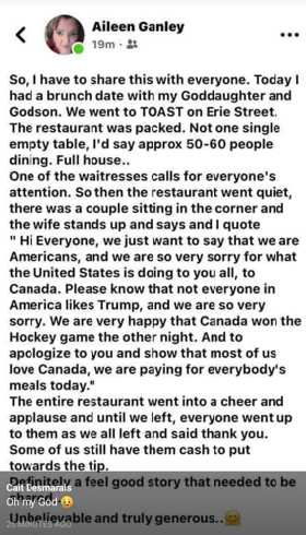 "She got up and she stood up and she said that she was American and she just wanted to apologize," says Taylor. "She said she knows that their president has caused a rift in what was happening between our countries and she wanted us to know that not all Americans are bad people. She apologized for it and as a way to give back, she was going to pay for everyone's breakfast and of course led to loud cheers from everybody that was sitting down and she congratulated us on our hockey win."