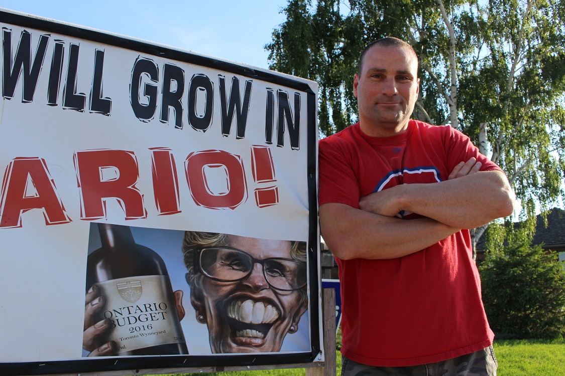 Jamie Diniro has a great big anti-Kathleen Wynne sign that features a caricature of the premier with exaggerated teeth and a bottle of wine that reads "Ontario Budget 2016" on his front lawn on Erie St. N.