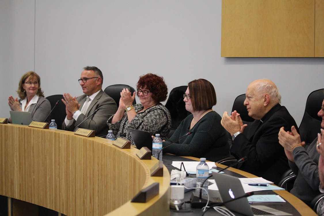 WECDSB trustees applaud for Assumption College Catholic Secondary School teacher Diane Nehmetallah as she receives the Loran Teachers Building Leaders Award at the board's regular meeting held on January 30, 2018. (Photo by Ricardo Veneza)
