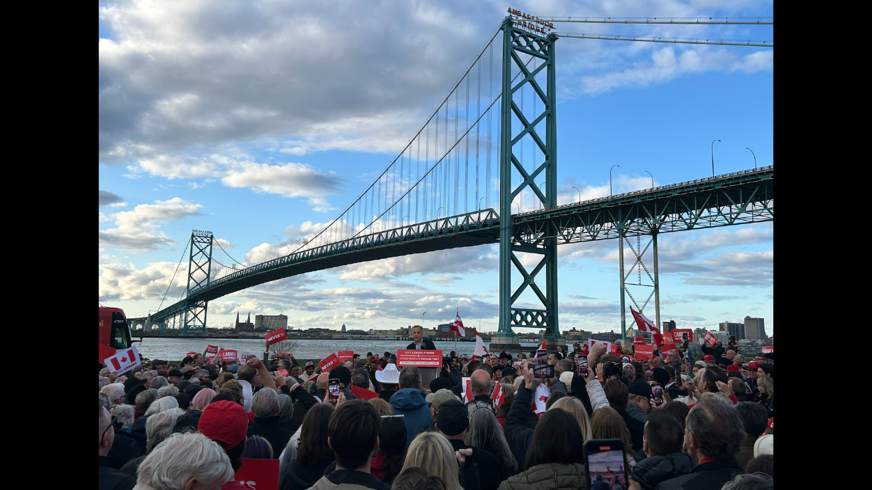 Filled with repeated hockey references and jabs at Conservative Leader Pierre Poilievre, Carney, with his back-pointed to the Ambassador Bridge, centered his remarks on Canada-U.S. relations.