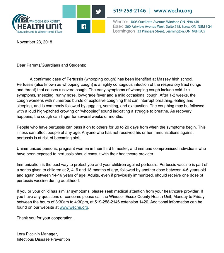 A release from the Windsor-Essex County Health Unit posted on the Massey High School website. (Photo courtesy of www.publicboard.ca/school/Massey)