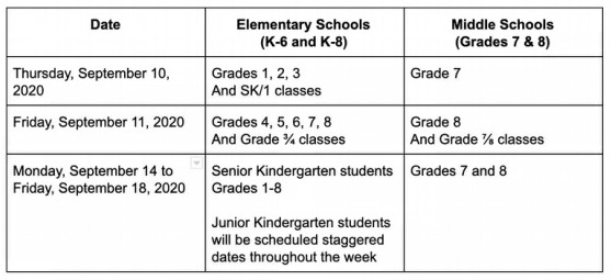 Students' start Sept. 10 for Grades 1 through Grade 3, with the exception of middle schools that would see Grade 7's start. Grades 4 to 8 begin on Sept. 11 with Grade 8's returning to class at middle schools.