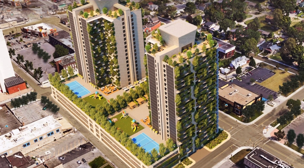 Passa Associates Architects rendering of the exterior design of 'Green Towers' project at 777 Goyeau St. E. near Elliott Street in Windsor. (Image courtesy of Passa Associates Architects)
