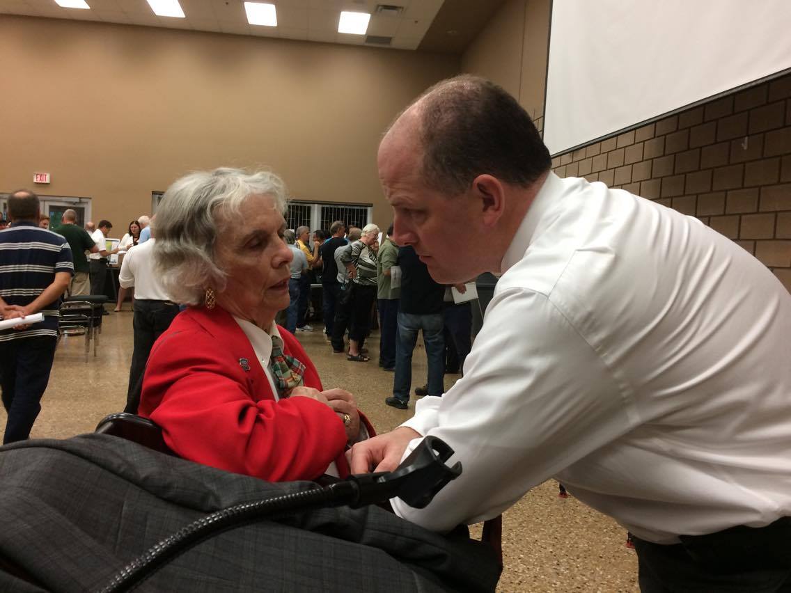 Mayor Drew Dilkens speaks with resident at city's Ward 6 meeting (Photo by AM800's Zander Broeckel)