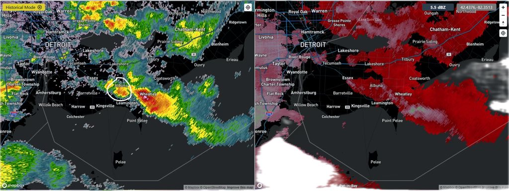 Based on video/photo evidence plus radar, the NTP has confirmed that a tornado occurred near 5:35 EDT today close to Albuna, ON. The parent storm (circled) was developing rapidly at that time and had no rotation on radar - making it a ‘landspout’-type tornado. #ONstorm 1/2 pic.twitter.com/DFzPYKjpZH