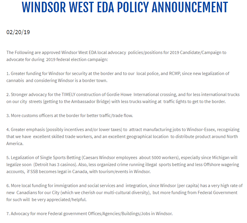 Windsor-West Conservative Party of Canada Electoral District Association's 2019 platform for Canada's Federal Election. (Photo courtesy of www.windsorwestcpc.com/eda-news)