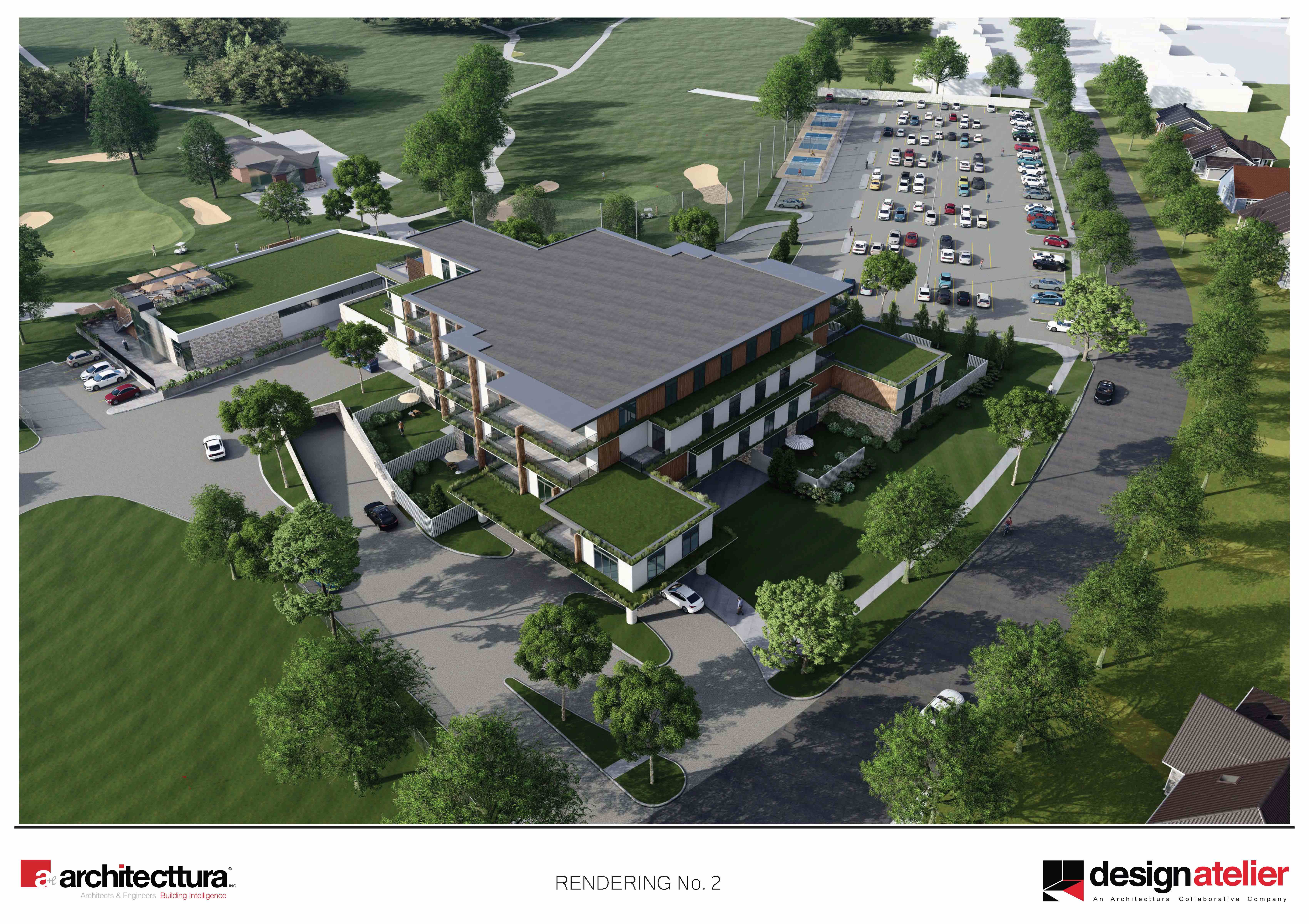 The proposed plan included the development of a 38-unit luxury condo building with a green roof, underground parking, tiered levels, glass railings, and balconies, along with a new clubhouse for the golf course.