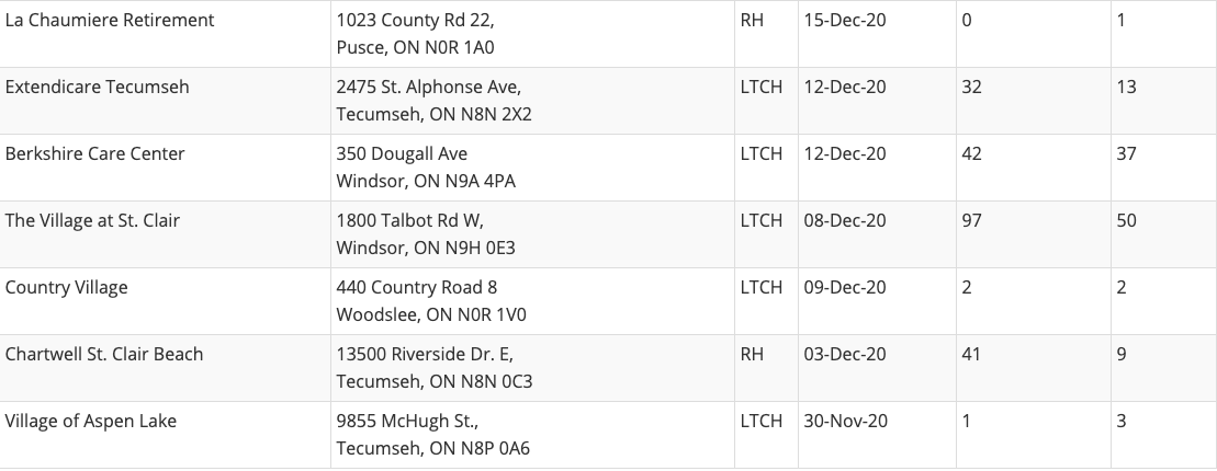 There are 41 residents plus nine staff members dealing with the virus at Chartwell St. Clair Beach and at Extendicare Tecumseh, 32 residents and 13 staff members have all tested positive.