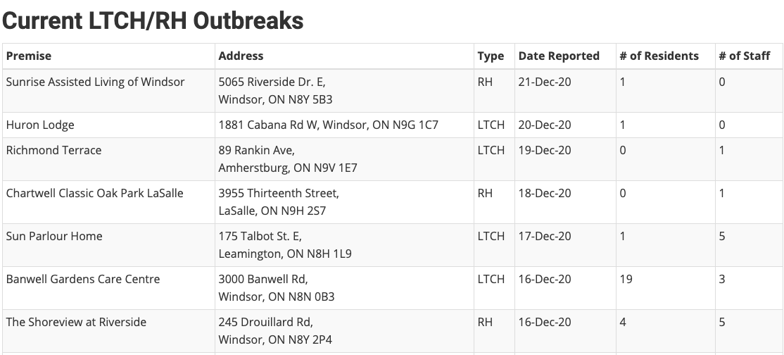 The Windsor-Essex County Health Unit is now reporting 14 outbreaks at area long term care and retirement homes.