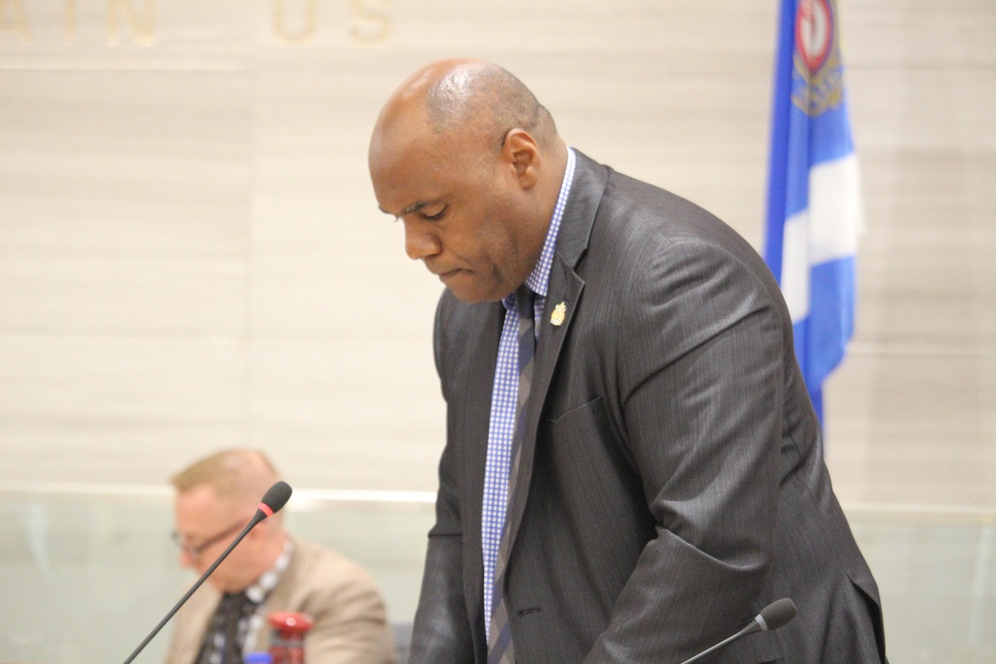 Ward 2 city councillor John Elliott presents a petition calling for a sidewalk on Prince Rd. connecting Mic Mac Park to Barrymore Ln. after a city bus hit a little girl. Photo taken June 4, 2018. (Photo by Ricardo Veneza)