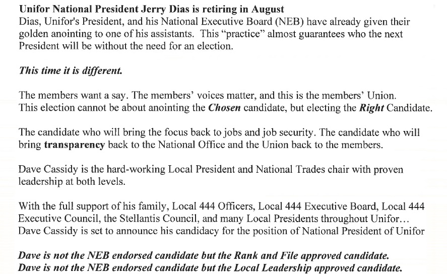A statement issued by Unifor Local 444 on Dave Cassidy's plans to seek the role of national president of Unifor. Feb. 21, 2022 (Image courtesy of Unifor Local 444)