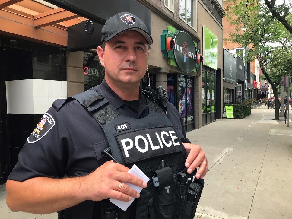 Windsor Police Service Constable Adam Young outside of Fun Guyz, 395 Ouellette Avenue, where a search warrant was executed by police, July 6, 2023. (Photo by AM800's Rob Hindi)
