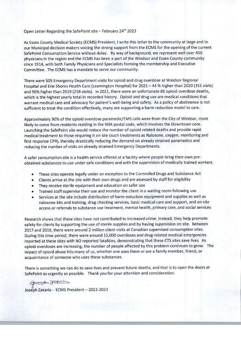A letter from the Essex County Medical Society regarding the SafePoint Consumption site in Windsor. Feb. 24, 2023