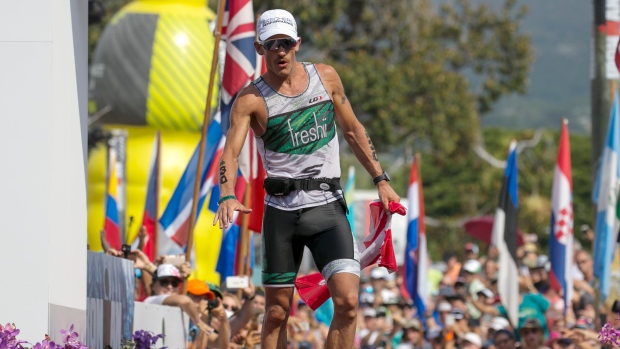 Lionel Sanders crosses the finish line in second place at the Ironman World Championship Triathlon, Saturday, Oct. 14, 2017, in Kailua-Kona, Hawaii. (AP Photo/Marco Garcia) (photo courtesy of CTV News)
