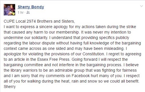 In a statement posted online, Sherry Bondy apologized for her actions during the 231 day Essex County library strike and said going forward she will respect the bargaining committee and not interfere in the bargaining process.