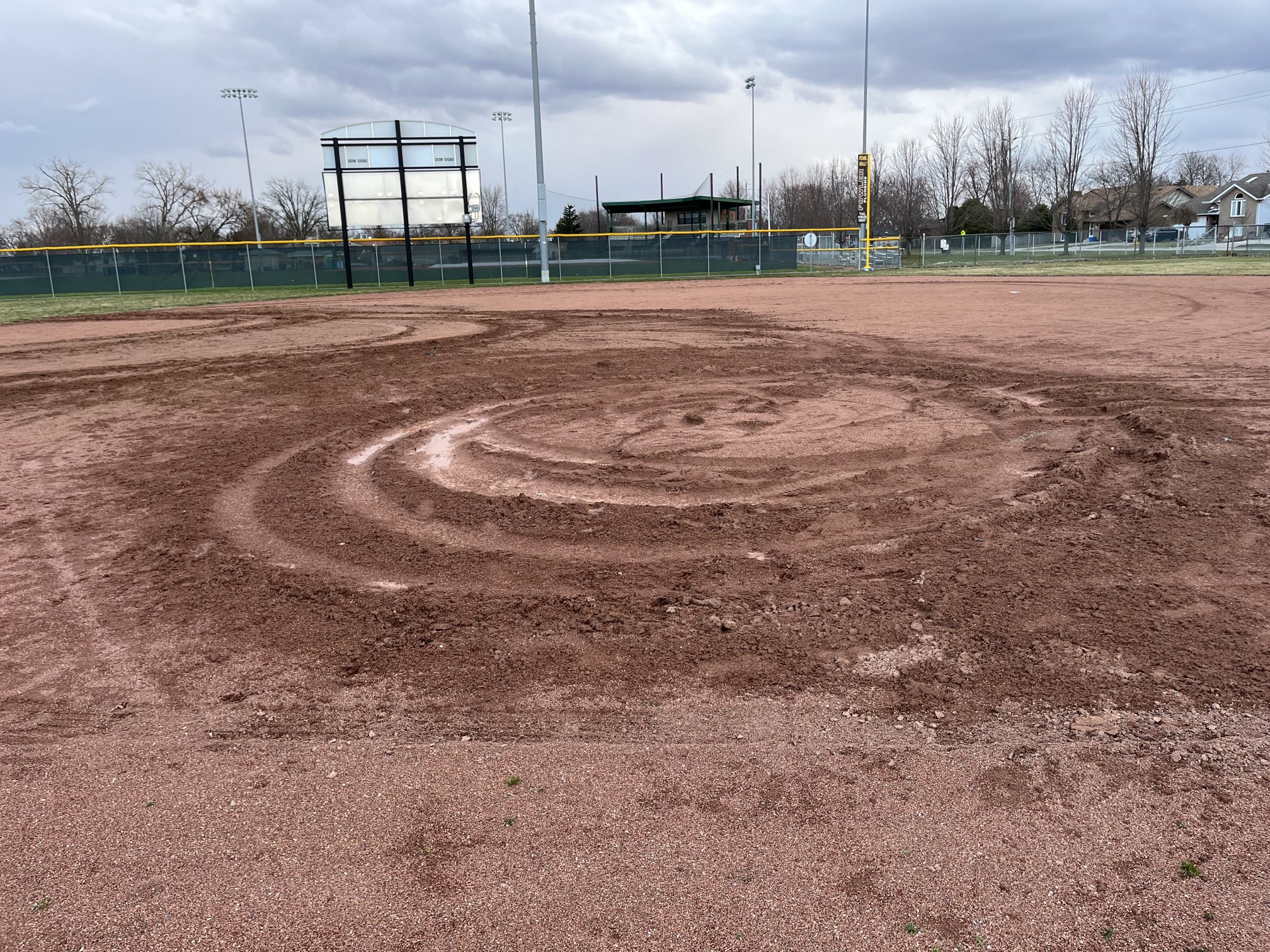 "Someone was in the infield, the practice infield and the grassy area that's immediately adjacent to that which is easily accessible off of the main entry way into the park and someone was in there with their vehicle and looked like they were doing donuts and managed to do quite a bit of damage both to the clay practice infield and to the grassy area adjacent," she says.