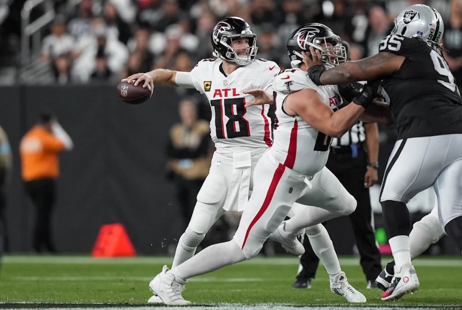 Desmond Ridder's first attempt was incomplete and his second was intercepted by Jessie Bates III, allowing Atlanta to escape Las Vegas with a 15-9 victory Monday night and keep pace in the NFC South.