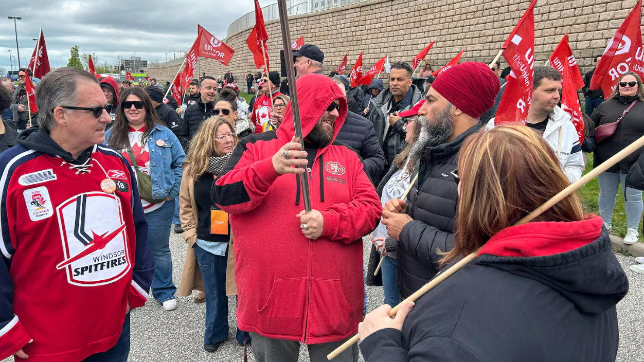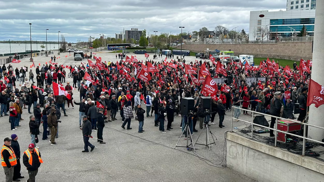 More than 1,000 union members poured into Festival Plaza along the Detroit River armed with Unifor flags and boisterous cheers.