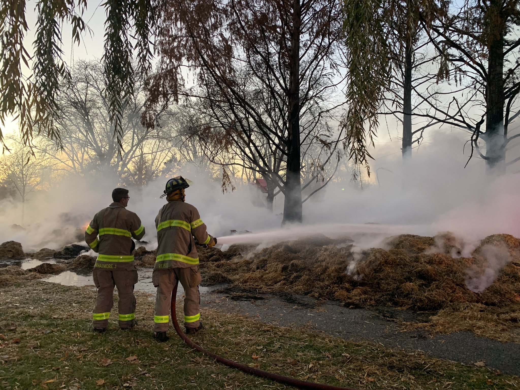 The city's Public Works department brought in a front-end loader to move the straw around so crews could attack the flames and battle hot spots.