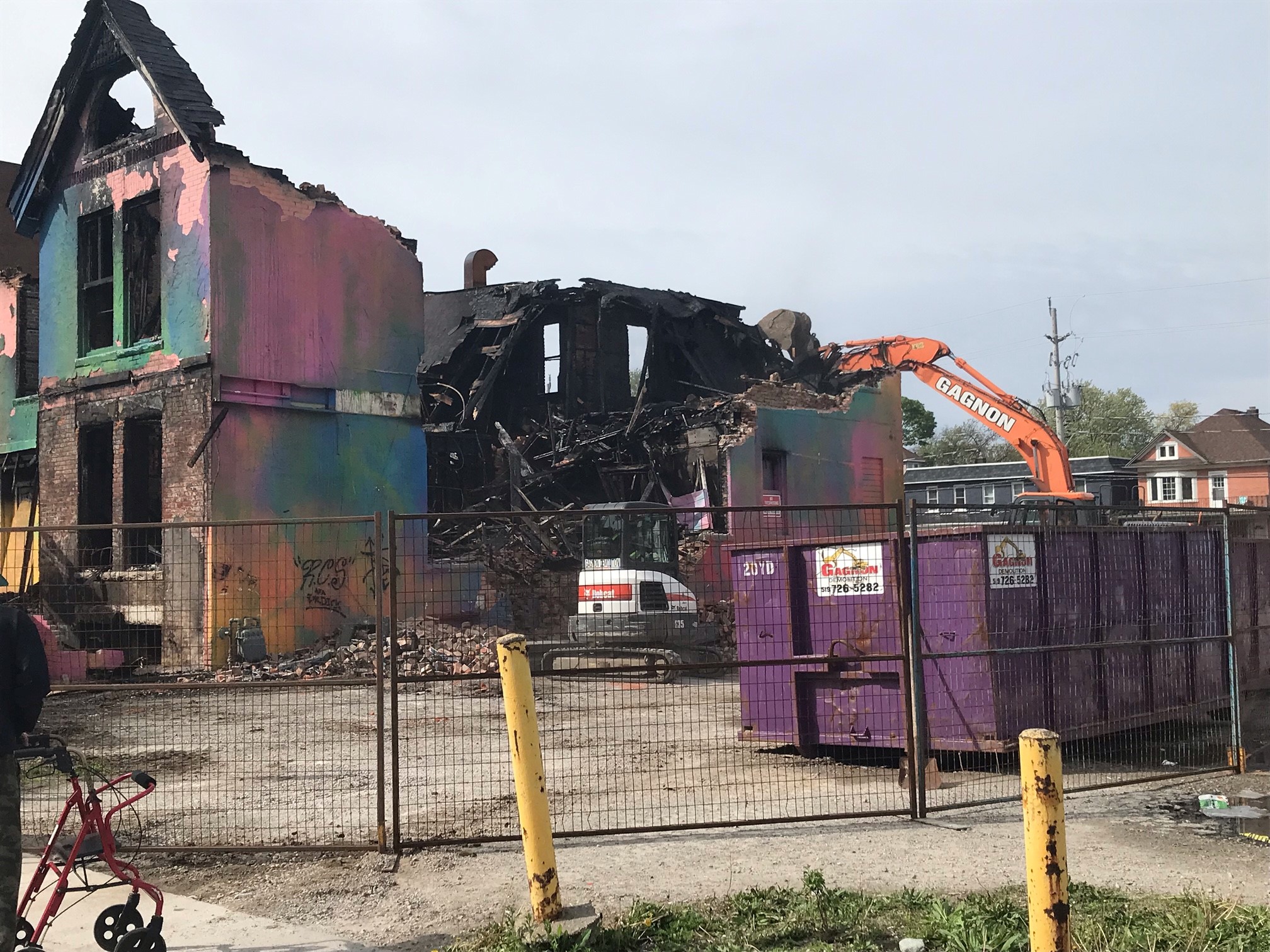 The ‘Rainbow house’ on Ouellette Ave. is coming down after last week’s fire. Demolition crews on scene. #cklw @AM800CKLW pic.twitter.com/t1qqfRBw9K