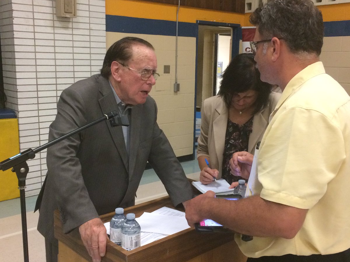 Ward 9 Councillor Hilary Payne speaks with a resident at his annual ward meeting (Photo by AM800's Zander Broeckel)