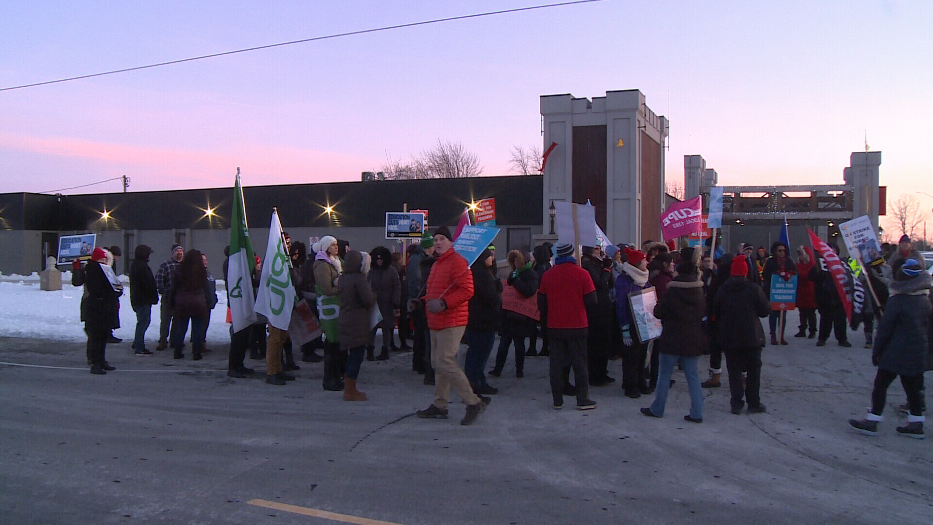 Members of the Windsor and District Labour Council as well as local teacher's unions and their supporters gathered outside the entrance.