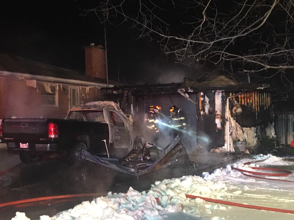 A garage fire on Jane St. in Leamington on the morning of February 1, 2017 (Photo courtesy of Leamington Fire Service)