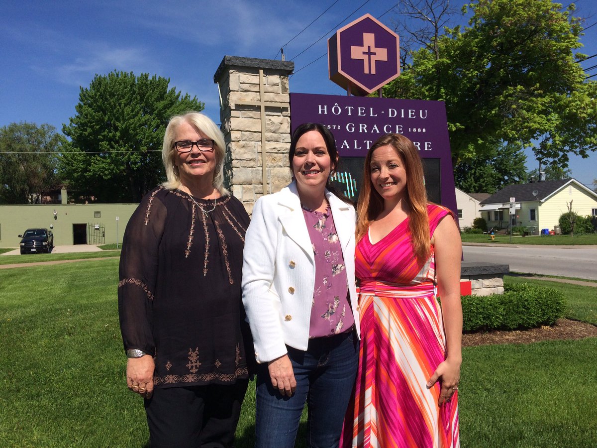 (L to R) Former Ouellette Campus social worker and discharge planner Suzy Sulaiman, Windsor-West MPP Lisa Gretzky and local mother Andrea Corby. May 25, 2018 (Photo by AM800's Teresinha Medeiros)