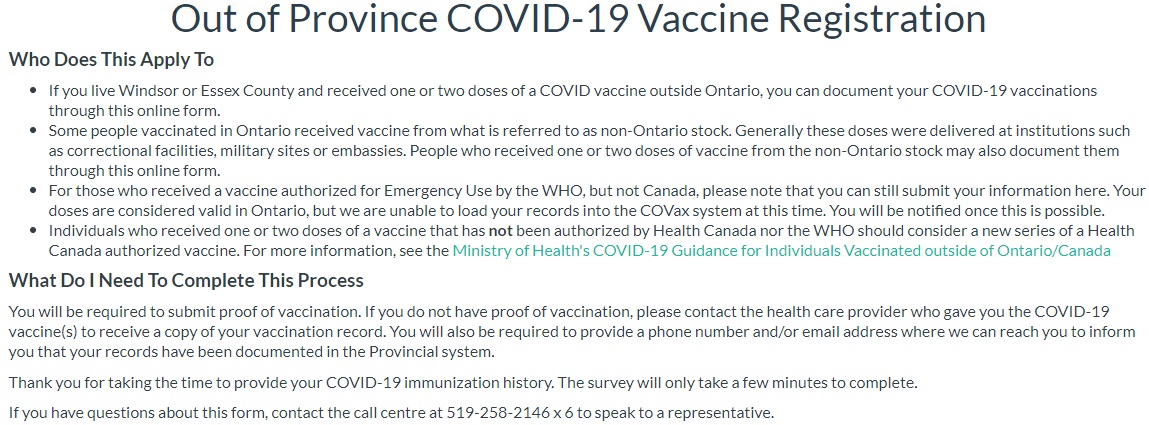 The Windsor-Essex County Health Unit is launching an online registry for individuals who received a COVID-19 vaccine outside of the province or country.