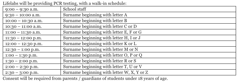 On Saturday morning, free, voluntary testing will be provided for in-person students, staff and children at day cares within the N9E postal code.