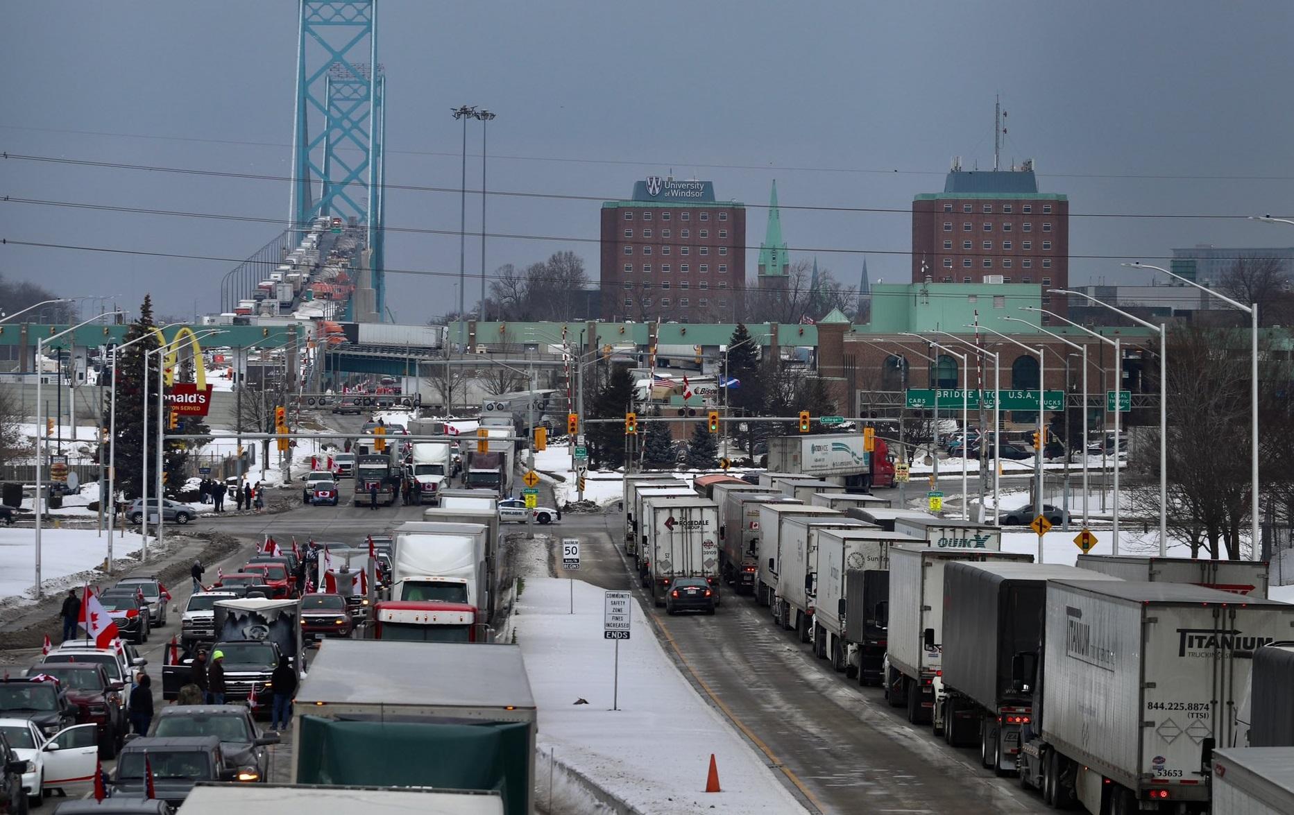 On Feb. 7, a group of people stopped along Huron Church Road heading to the Ambassador Bridge, protesting COVID-19 restrictions and mandates, halting traffic until police officers moved them off the route on Feb. 13.