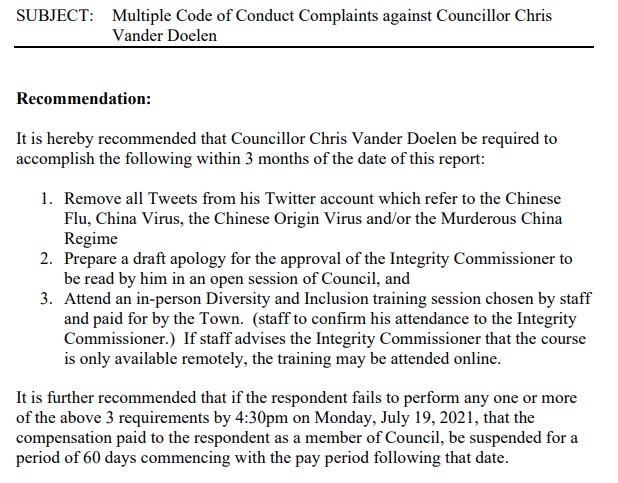 The Integrity Commissioner for the Town of Essex is recommending councillor Chris Vander Doelen make a public apology and attend an in-person diversity and inclusion training session.