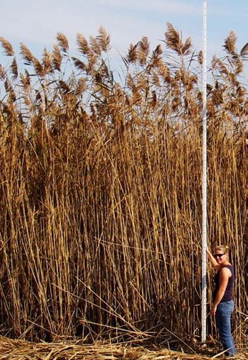 Phragmites australis is a reed like plant that groups tightly, can climb meters in height, grows quickly and strangles out surrounding plants by secreting toxins from its roots.